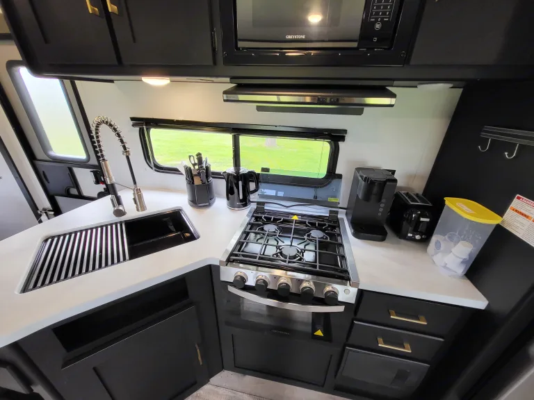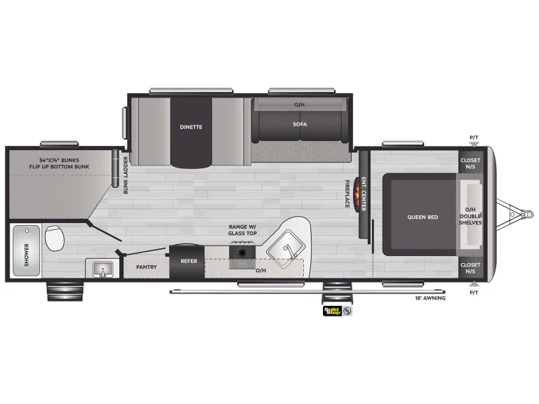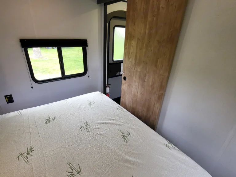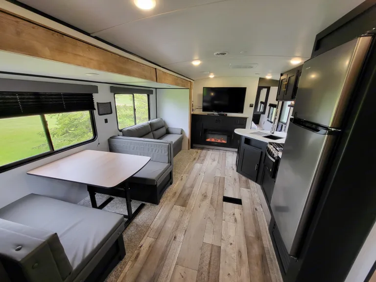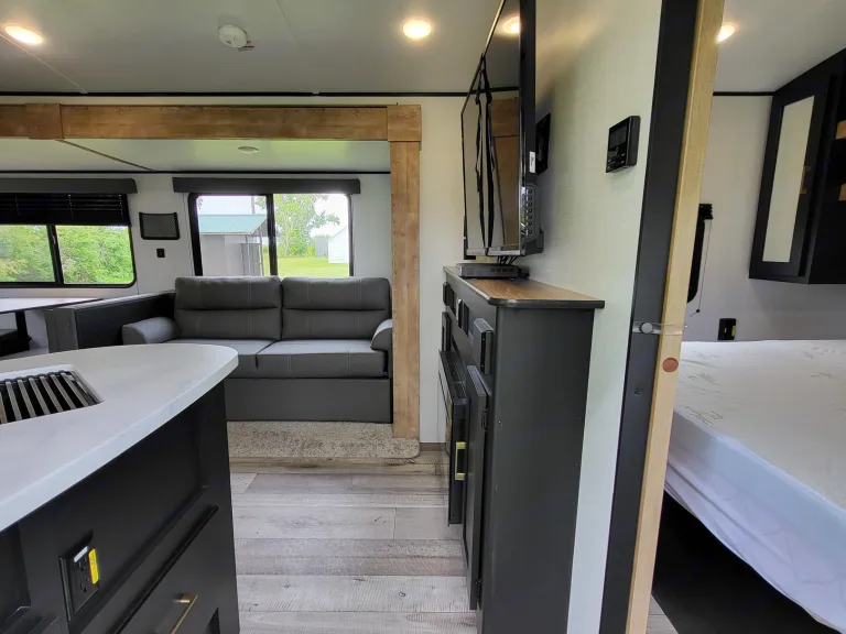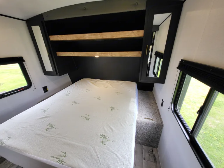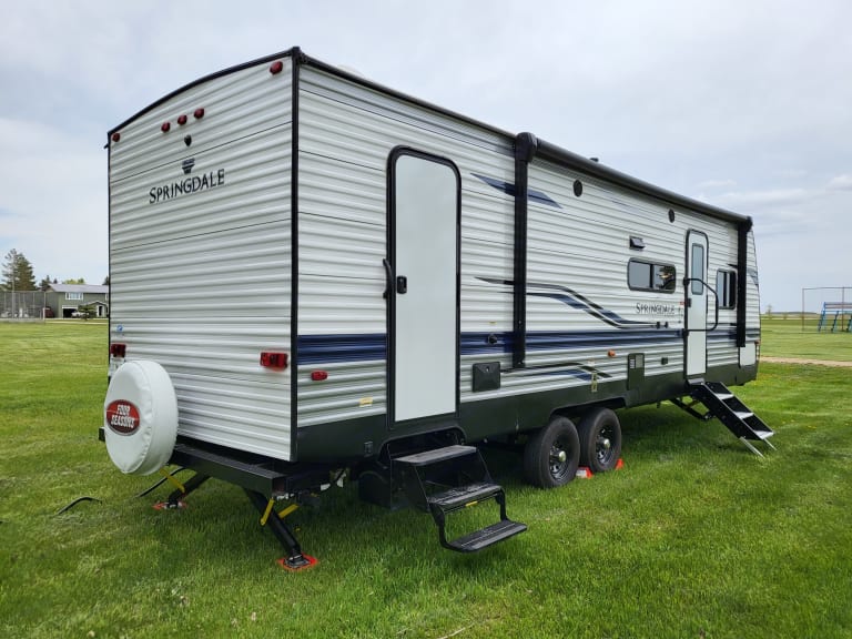 The Springdale is a brand new 2022 Keystone travel trailer. Featuring a queen size bed, bunk beds, dinette, jackknife sofa, and a 50" TV. Double entrance with access to bathroom from outside. Modern interior finish with black furniture and wood accents, with lots of daylight through large windows all around. Also this unit comes with a power slide, power awning, as well as power tongue and stabilizer jacks, and a solar panel on the roof to keep your refreshing beverages cool.What's included4x camping chairs, folding table, cutlery and dishware for 8, cookware, and cleaning supplies are included. We'll throw in a tabletop BBQ with propane for $20. Delivery up to 250km is available for a fee.Other things to notePets welcome for a $50 fee, no festivals, no smoking. Please make sure to bring bedding, towels, and personal hygiene products (soap, etc.)