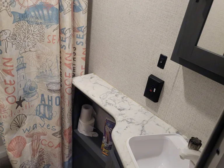 Has a queen size bedroom with doors for privacy.