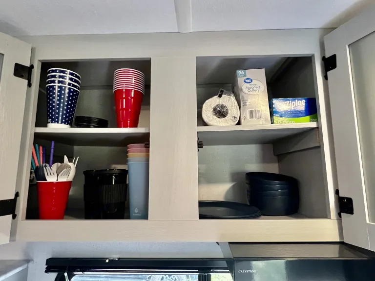 -4 plates, 4 bowls, 4 sets of reusable utensils, cups, 2 coffee cups
