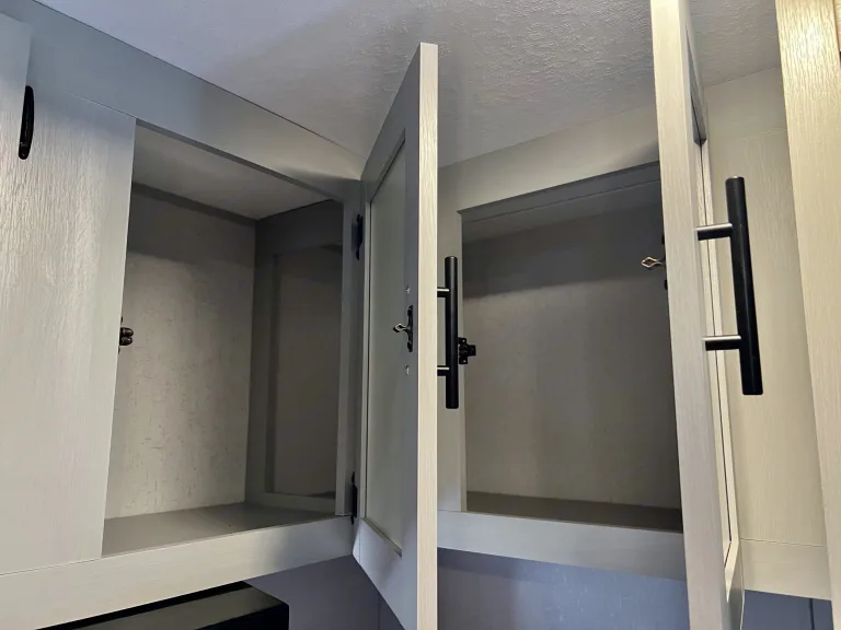-Separate bedroom with 3 closets and under bed storage.-Back deck with safety railing.
