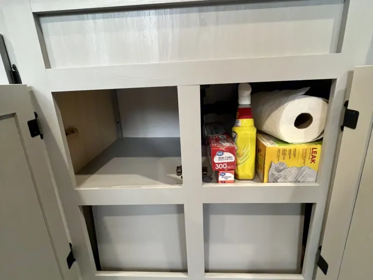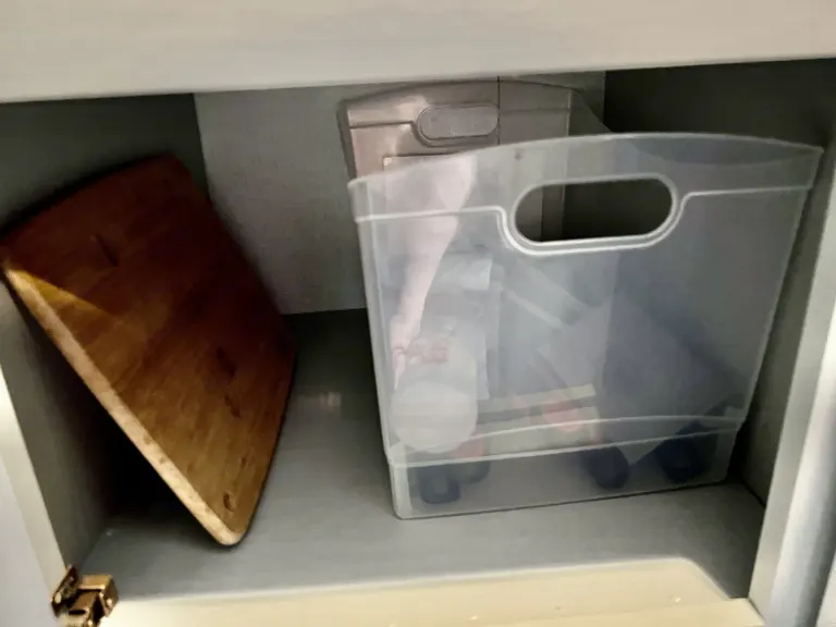 -ziplock bags, 1 paper towel roll, cleaning spray, dish soap, sponge, garbage bag, plastic wrap, aluminum foil