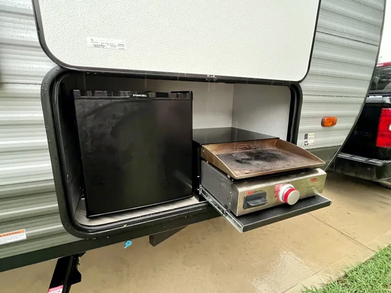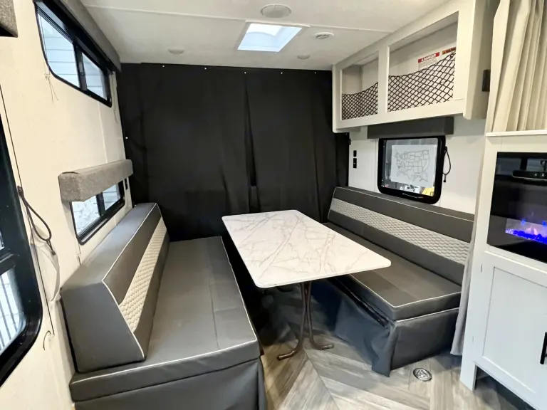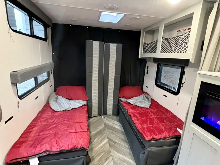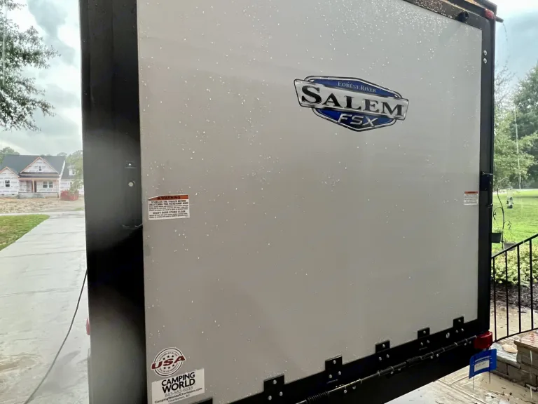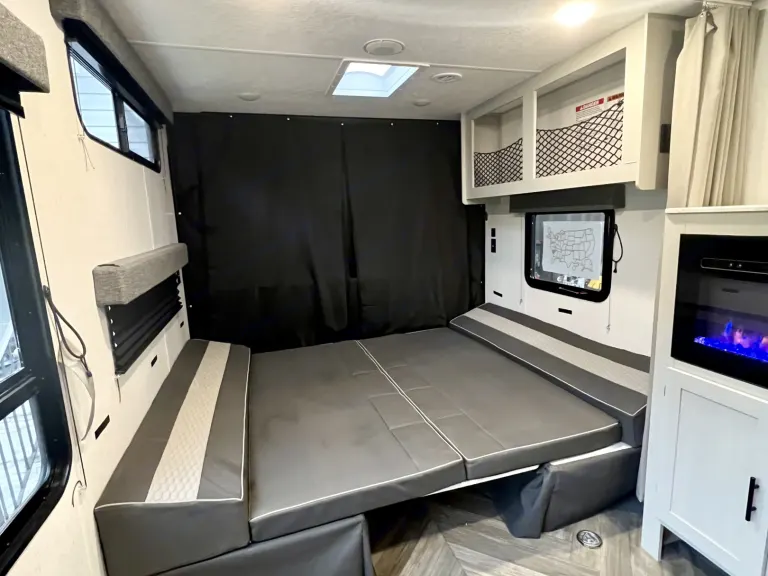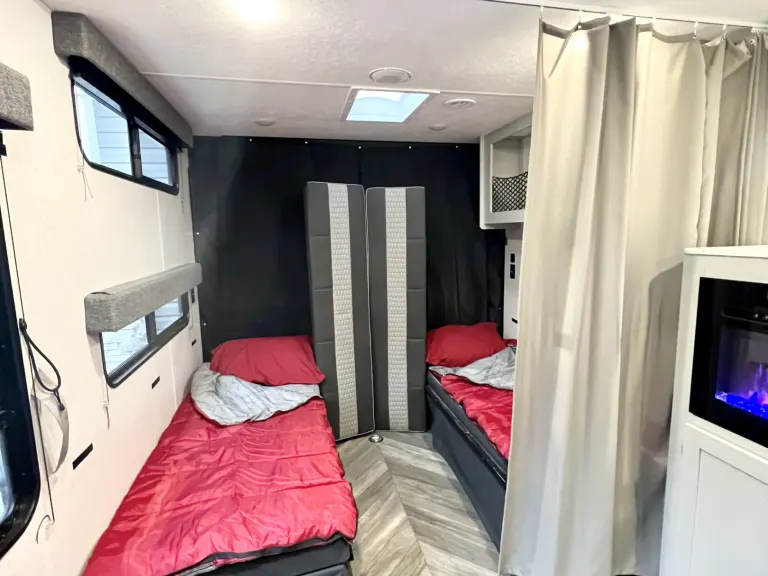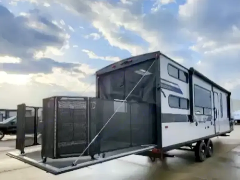 Adventure awaits! Get ready to take along your off-road toys, bike the trails, and clean off after a fun day in this 2022 Forest River Salem FSX toy hauler travel trailer. This model provides sleeping space for 4-5 people which is perfect for couples and families alike! The main living space features a conversation couch set that can be made into either a full king mattress or two individual twin beds. The living room sleeping space can be conveniently sectioned off with a privacy curtain. On the other side of the trailer you will find a private bedroom with a queen bed. When you aren’t using the back ramp to load your toys, it can easily be converted to a back deck with a waist high railing for safety. With the addition of the full bathroom and kitchen, you have everything you need for countless outdoor getaways! Take the party outside with an outdoor sound system, lighting, awning and outdoor kitchen equipped with a griddle and fridge.Highlights include: